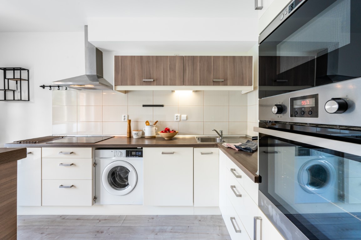 Byt je prakticky řešený – nabízí obývací pokoj s kuchyňským koutem, plně vybavenou linkou se spotřebiči (myčka, sklokeramická deska, trouba, digestoř i lednice s mrazákem). Dále ložnici orientovanou na severozápad, světlý dětský pokoj na jihozápad, předsíň s velkou šatní skříní, koupelnu s vanou a samostatné WC.